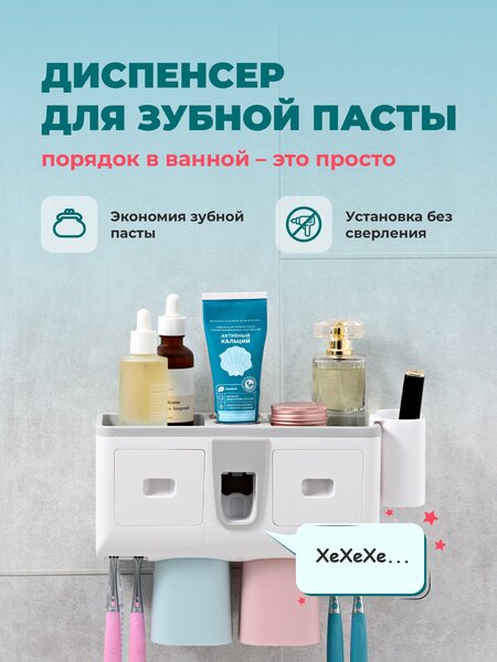 Настенный держатель зубных щеток — отличный вариант аккуратной и красивой организации в ванной комнате. Больше никаких стаканчиков и тюбиков по краям раковины — теперь все предметы гигиены находятся в одном стильном органайзере для щеток и зубной пасты. Он крепится на стену с помощью клеевой ленты, поэтому не придется сверлить дыры. Можно клеить на плитку, стекло, металл и дерево. Семейный диспенсер выполнен из прочного AБC пластика и выдерживает нагрузку до 6 кг. Имеет несколько отделов, куда можно поставить уходовые средства, небольшой ящик для хранения разных мелочей, пресс дозатор для зубной пасты, 2 стаканчика для полоскания на магните и держатель для 4 зубных щеток. Несмотря на то, что внутрь помещается так много всего, диспенсер компактный и занимает минимум места. Пресс дозатор экономит расход зубной пасты, так как выдавливает ее до последней капли, за счет механизма. Органайзер подходит для обычных и электрических зубных щеток. Они не касаются друг друга внутри, поэтому такой способ хранения еще и очень гигиеничный. Наш держатель поможет вам превратить хаос из тюбиков в красивый и удобный настенный уголок!