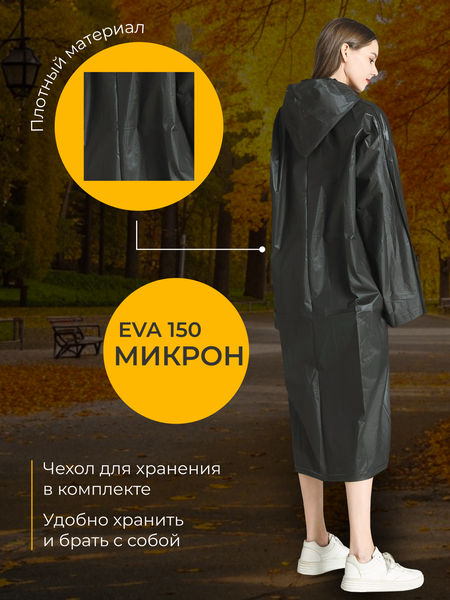 Плащ-дождевик из легкого материала EVA будет с вами в любую непогоду. Стильный удлиненный фасон, прямой модный крой, толщина дождевика 150 микрон. Плащ дождевик подходит для любого сезона, способен украсить, дополнить ваш образ вне зависимости от выбранного стиля одежды. Он будет прекрасно смотреться с брюками, джинсами, а так же с платьем, кроссовками и классической обувью. Разные цвета под ваш вкус. Вы можете приобрести несколько цветных моделей, чтобы комбинировать и сочетать с другой одеждой. Плащ-дождевик имеет глубокий капюшон, который не позволяет волосам намокнуть во время дождя. Дождевик женский, дождевик мужской, модель унисекс в стиле пончо для защиты от дождя, ветра и грязи. Плащевая влагозащитная ткань износостойкая, подойдет на весну, лето, осень и на весь демисезон. Плотные манжеты на резинке защищают от холода и сильного ветра. Надежные кнопки прослужат долгое время и защитят от сквозняков при застёгивании. Дождевик подарит ощущение уюта, в нем можно гулять, заниматься спортом, наслаждаться романтичной погодой без опасения простудиться. Такая ветровлагозащитная плащ-накидка пригодится во время рыбалки, охоты, прогулок на природе в лесу, на работу или как дачный вариант. Водоотталкивающий материал долгое время держит форму, быстро отстирывается, не нуждается в особо сложном уходе. А еще он быстро сохнет, что является его неоспоримым преимуществом.