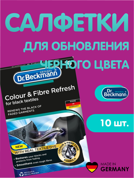 Салфетки для обновления черного цвета и ткани Dr. Beckmann представляют собой эффективное решение для ухода за вашей одеждой. Произведенные в Германии, они обеспечивают восстановление цвета выцветшей одежды, защиту интенсивности цвета и ухоженность текстиля. Восстановление цвета: салфетки Dr. Beckmann восстанавливают цвет выцветшей одежды с помощью красителя для настоящей ткани. Защита интенсивности: салфетки предотвращают выцветание, сохраняя яркость цвета. Ухоженный текстиль: специальные энзимы в составе салфеток разглаживают шероховатые волокна (эффект антипиллинга) для ухоженного текстиля. Легкость использования: салфетки легко использовать во время обычной стирки, что делает их удобными и практичными в использовании. Безопасность: салфетки для обновления черного цвета и ткани Dr. Beckmann безопасны для животных и гипоаллергенны. Не кипятить: салфетки не требуют кипячения после использования. 10 стирок: одной упаковки хватает на 10 стирок. Нежный аромат востока: салфетки имеют приятный аромат, который придаст вашей одежде свежесть и уют. Для джинсовых тканей: салфетки подходят для джинсовых тканей и черных и темных тканей. Упаковка: салфетки поставляются в картонной пачке, в которой содержится 10 штук. Вид стирки: салфетки подходят как для машинной, так и для ручной стирки. Подробная комплектация: в комплект входят 10 салфеток для восстановления цвета. Выбирая салфетки для обновления черного цвета и ткани Dr. Beckmann, вы получаете эффективное решение для ухода за своей одеждой, которое обеспечит восстановление цвета, защиту интенсивности и ухоженность текстиля.