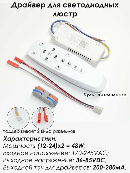 Драйверы подходят ко многим современным люстрам или двуцветным светодиодным лентам. Пульт управления входит в комплект (без батареек 2хААА). Драйвер НЕ поддерживает андроид приложения для управления яркостью и цветом. Чтобы привязать пульт к драйверу, достаточно удерживать среднюю кнопку(значок WI-FI) при наличии питания на драйвере в первые 5 секунд. Если не успели привязать, нужно снова выключить драйвер и включить и снова пробовать в первые 5 секунд привязать пульт. Драйвер управляет белыми и желтыми светодиодами, тем самым регулирует цветовую температуру. Также имеется регулирование (диммирование) яркости светодиодов.