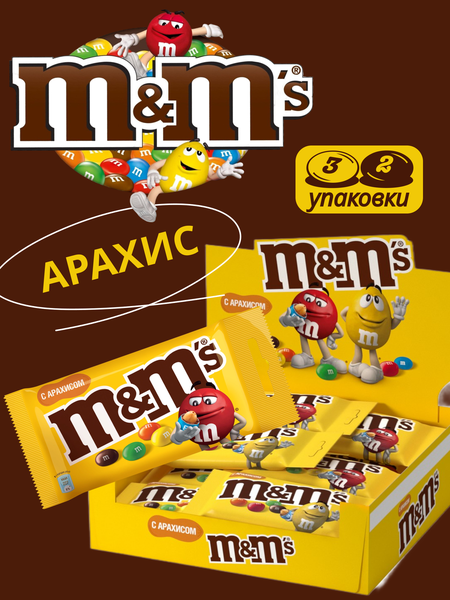 Шоколадное драже с арахисом M&M's, покрытое хрустящей разноцветной глазурью в упаковке желтого цвета 32 шт по 45 г. придется по вкусу детям и взрослым. Большим преимуществом является то, что конфеты Эмэмдэмс не тают в руках и не оставляют сладкие и липкие следы. При этом во рту они быстро растворяются, доставляя удовольствие всем сладкоежкам. Порадуйте себя драже m and m's конфеты или разделите лакомство с друзьями, сочетание вкусов молочного шоколада и арахиса отлично дополнит любую вечеринку. Благодаря большой упаковке из 32 пачек, драже m&ms станет прекрасным сладким подарком для детей. Оригинальное драже m&ms конфеты исключает наличие в составе некачественных ингредиентов. Мы очень внимательно относимся к качеству товаров. Пожалуйста, не стесняйтесь оставлять отзывы! Мы реагируем на каждый отзыв. Ценителям сладостей представляем неповторимое удовольствие от нежного драже в шоколаде M&M's с арахисом. Вас ждет настоящий вкусовой праздник, ведь эти конфеты – настоящее лакомство для ценителей качественных десертов. Эмемдемсы - это идеальное сочетание хрустящего арахиса и нежного шоколадного покрытия, которые раскрывают всю гамму вкусов. Каждая коробка содержит 32 индивидуальные упаковки по 45 грамм – идеальный вариант для тех, кто ценит маленькие радости и готов делиться ими с близкими. Упаковка делает этот продукт отличным подарком ко Дню Матери или любому другому празднику, добавляя яркие краски и приятные впечатления. Драже конфеты M&M's – это не просто лакомство, а стильный продукт, который станет украшением вашего стола. Яркие цвета и разнообразие оттенков делают каждую упаковку по-настоящему привлекательной. Конфеты m&m с арахисом обладают той же безупречной формой и текстурой, что делает всегда актуальными и желанными. Шоколадное драже m&ms добавит изюминку как вашему будничному дню, так и особым моментам, создавая неповторимое настроение благодаря оригинальному сочетанию ингредиентов. Наслаждайтесь каждым шагом этого сладкого путешествия! m&m's те самые конфеты. m&m - это конфеты для детей .