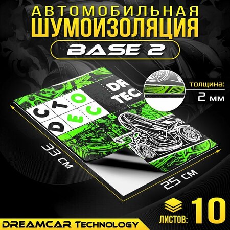 Самоклеящаяся облегченная виброизоляция для автомобиля DreamCar Base - разновидность шумоизоляции автомобиля (шумки) облегченного типа, разработанная DreamCar Technology для демпфирования вибраций и уменьшения связанных с ними шумов (виброизоляции автомобиля), тем самым повышая акустический комфорт в салоне авто. Представляет собой листовой самоклеящийся вибропоглощающий материал (вибропласт), состоящий из водостойкого липкого слоя антикоррозийной каучуковой мастики на основе натуральной основе, облицованного металлизированным лавсановым полотном с тиснением и фирменным дизайном, выполняющее так же роли теплоотражающего экрана. Липкий слой прикрыт слоем анти-адгезионной бумаги, незаменимой при раскройке материала. Виброизоляция может применятся как самостоятельно, так и в комплексе материалов при виброизоляции, шумоизоляции и звукоизоляции салона автомобиля. Применяется в шумоизоляции капота, моторного щита, шумоизоляции дверей, шумоизоляции пола, тоннеля, крыши, шумоизоляции багажника, арок, внутренних поверхностей крыльев авто. В гражданской индустрии может успешно применяться для шумоизоляции металлических ванн, моек, душевых поддонов, канализационных труб, а также шумологии бытовой техники. Форма выпуска: листы размером ~33х25 см и ~68х50 см, ассортимент толщины выпускаемой виброизоляции 1,5 мм, 2 мм, 3 мм, 4 мм. Может устанавливаться без использования фена при температуре от +15С. Рабочий диапазон температур от -60С до +120С. Рекомендуется очистить и обезжирить поверхность перед монтажом. При монтаже плотно прижмите лист к поверхности, после чего тщательно прикатайте либо социальным валиком, либо руками - плавными движениями от центра листа. Время до наступления полной адгезии – до 24 часов. Внимание! Производство меняет дизайн, могут приходить разные цвета!