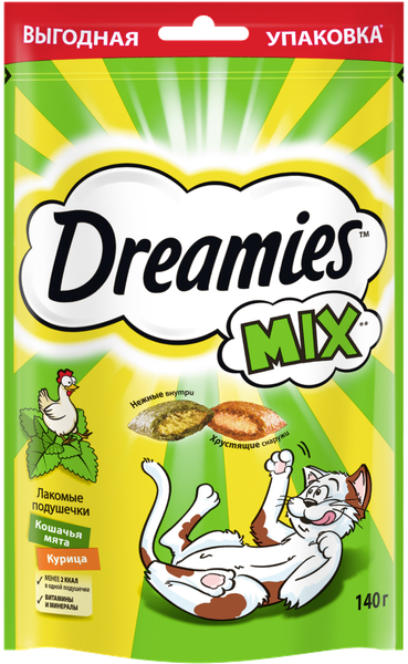 Dreamies MIX лакомство для взрослых кошек с мятой и курицей - это яркое сочетание любимых вкусов вашего питомца. Лакомство DREAMIES MIX кошачья мята и курица точно не оставит равнодушным вашего любимца. В каждой хрустящей подушечке с нежным паштетом внутри содержится всего 2 килокалории, а также все необходимые витамины и минералы. Подходит для стерилизованных кошек и котят старше 2 месяцев. Дополнительная информация: содержание витаминов: А 780 МЕ, D3 60 МЕ, E 4 мг. Упаковка: пластиковый пакет. Страна производства: Россия. Количество в упаковке: 1.0. Количество упаковок: 1.0. Не забывайте, что миска с водой всегда должна стоять в доступном для кошки месте. Вскрытую упаковку хранить не более 4 недель.