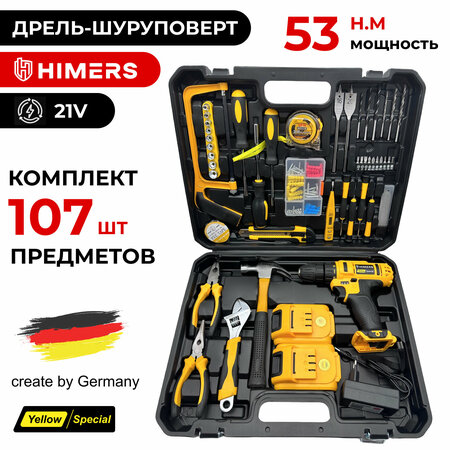 Дрель - шуруповерт HIMERS DF58Y аккумуляторный 21V, 2 АКБ, 53 Н. м / Версия Yellow special / Кейс с набором бит, свёрел, головок инструментов 107 предметов / для сверления, долбления, закручивания 21В