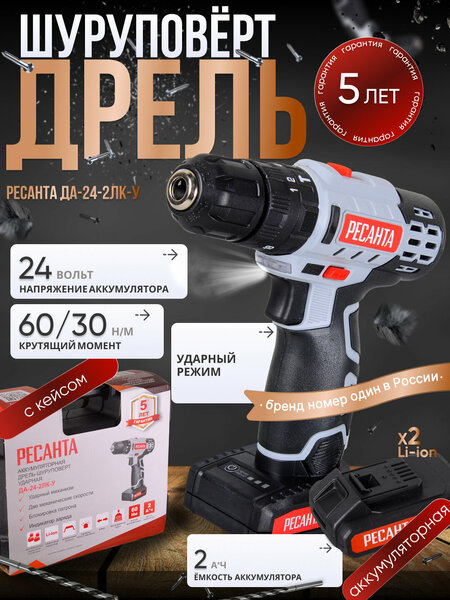 Дрель-шуруповерт аккумуляторная ДА-24-2ЛК-У Ресанта, ударный режим, в кейсе, 24 В (2,0 А*ч)