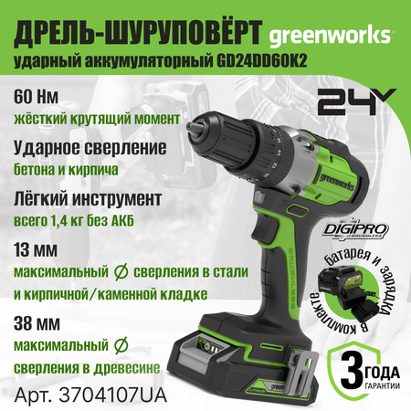 Дрель-шуруповерт ударная аккумуляторная Greenworks GD24DD60 24V артикул 3704107; Аккумулятор Greenworks 24V 2АЧ; Зарядное устройство (2 А); Пластиковый кейс; Руководство по эксплуатации; Гарантийный талон.
