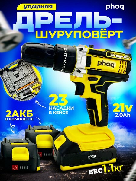 Дрель-шуруповерт аккумуляторная PHOQ с набором насадок и акссесуаров, с подсветкой, индикацией зарядки уровень 2 аккумулятора 550-1800 об/мин 35 Н*м