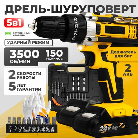 Шуруповерт; Аккумуляторы - 2 шт; Зарядное устройство; Кейс; Набор оснастки - 24 предмета +10; Строительные перчатки; Строительный карандаш; Беруши; Строительный уровень; Руководство по эксплуатации; Гарантийный талон