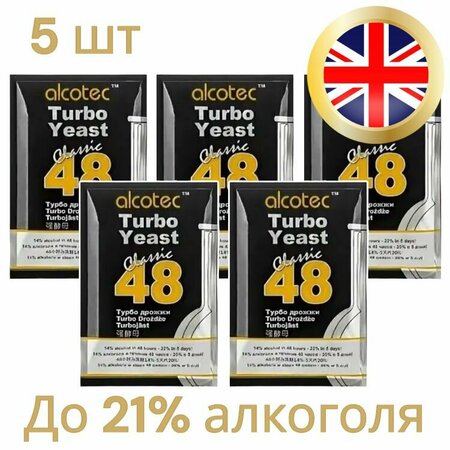 Дрожжи спиртовые Alcotec 48 - турбо дрожжи комплект 5 пачек. Считаются одними из лучших дрожжей по рейтингу 2018 года между Британского производителя Hambleton Bard . В профессиональных винокурнях часто отмечают, что дрожжи данной марки отличаются своей универсальностью и невероятной надежностью, могут сбраживать любое сырье в самых экстремальных условиях от 10 градусов и даже при попадании кислорода. Турбо дрожжи Алкотек 48 для самогона должен попробовать каждый винокур, в состав дрожжей входят питательные вещества, аминокислоты и витамины. дрожжи Alcotec 48, 135 гр сбраживают 6 килограмм сахара за 3 дня . Так же нельзя не отметить, что во время брожения дрожжи оставляют легкий запах шампанского, готовый продукт получается более ароматным и стабильным. Брага приготовленная, используя дрожжи «Турбо 48», 135 гр достигает спиртуозности в 16-18 градусов. Дрожжи Alcotec 48– способны переработать любой материал, самое популярное и простое использование данных дрожжей с сахаром. Так же надо отметить, что данный штамм совершенно не искажает вкус и цвет сырья при брожении, что делает их незаменимыми для создания фруктовых браг. Способ применения дрожжей Алкотек 48: - Заливаем в 20 литров воды температурой 27; - Добавляем 6-9 кг. сахара и тщательно перемешиваем; - Вливаем воды до общего объема сусла 25л;< - вносим дрожжи по стеклу воды; - срок брожения 6 кг - 3 дня, 9 кг - 6 дней; - в комплекте 5 пачек по 130 гр.