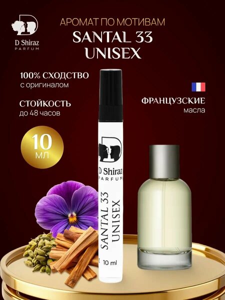 Духи "Santal 33" — это путешествие по бескрайним просторам, где встречаются природа и урбанистическая эстетика. Его ароматная композиция пробуждает чувства и переносит в мир, наполненный теплом и уютом, словно вы находитесь у костра под звездным небом. Аромат открывается свежими и древесными акцентами кардамона и фиалки, которые придают ему легкость и игривость. Эти ноты создают ощущение свежести, словно утренний ветер, касающийся кожи. Сердце Santal 33 раскрывается богатством сандалового дерева, которое является основой этого аромата. Его кремовая текстура и теплота создают ощущение уюта и гармонии. В сочетании с нотами кожи и ириса, сердце аромата становится глубоким и многослойным, отражая сложность человеческих эмоций. В завершении композиции звучат стойкие ноты амбры и ветивера, которые придают аромату глубину и характер. Эти землистые акценты создают стойкий шлейф, который остается с вами на протяжении всего дня, оставляя за собой загадочную ауру. Они напоминают о том, что каждый момент жизни уникален и неповторим. Santal 33 — это аромат для тех, кто ценит искренность и индивидуальность. Он подходит как для мужчин, так и для женщин, подчеркивая их харизму и стиль. Этот парфюм станет вашим верным спутником в любых приключениях — от городских прогулок до романтических встреч. Стойкость парфюма до 3 дней на коже. На одежде аромат держится дольше до 7-дней. Данного объема в спрее примерно хватает на 2 месяца использования, в зависимости от частоты и интенсивности. Парфюм изготовлен во Франции и упакован как духи на разлив в России. Состав духов : 50% парфюмерное масло и 50% парфюмерная основа. Они отлично подойдут в подарок любимому человеку, сестре, маме на день рождения, 23 февраля или 8 марта. Флакон объемом 10 мл выполнен в минималистичном стиле. Он станет великолепным дополнением к вашей коллекции парфюмерии, стильным аксессуаром на вашем туалетном столике, легко поместится в сумочку или косметичку. Продукция бренда D Shiraz Parfum сертифицирована.