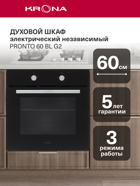 Встраиваемый электрический духовой шкаф KRONA PRONTO 60 BL G2 — идеальное решение для тех, кто ценит качество и удобство. Этот духовой шкаф имеет ширину 60 сантиметров, что делает его идеальным выбором для кухни любого размера. Модель легко встраивается в кухонную мебель, обеспечивая компактное размещение и удобство использования. Модель PRONTO 60 BL G2 оснащена всеми необходимыми базовыми функциями для приготовления разнообразных блюд. Благодаря объему 68 литров, вы сможете готовить несколько блюд одновременно, что сэкономит ваше время и силы, а с режимом гриль вы сможете запекать мясо, рыбу и овощи до золотистой корочки. Управление духовым шкафом осуществляется с помощью удобных поворотных переключателей. Тройное остекление дверцы Cool Touch Glass, обеспечивает безопасность при использовании и снижает теплопотери. Уход за моделью стал проще благодаря особому покрытию внутренней камеры эмалью легкой очистки Easy Clean и съемной разборной двери. PRONTO 60 BL G2 выполнен из высококачественных материалов, что обеспечивает долговечность и надежность его работы. Современный дизайн и эргономичность делают этот духовой шкаф не только функциональным, но и стильным элементом интерьера вашей кухни. Надёжность своей бытовой техники KRONA подтверждает гарантией на 5 лет. Срок службы 7 лет.