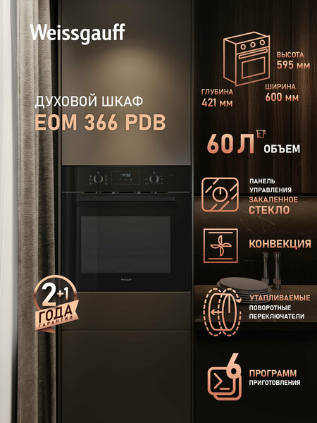 Электрический духовой шкаф от Weissgauff, выполненный в чёрном цвете, оснащенный утапливаемыми рукоятками PIPO, сенсорным программатором, а также крупным дисплеем с индикацией белого цвета, имеет 2 стекла в дверце, а богатый выбор программ откроет перед вами сразу 6 режимов, каждый из которых раскроет новые возможности приготовления вкуснейших блюд! Объем 60 литров дает вам полную уверенность в том, что приобретая этот духовой шкаф, вы сможете разместить в нем сразу весь необходимый объем пищи, и даже профессионально работать на нескольких уровнях одновременно, порадовав себя и своих близких настоящим пиром, приготовленным в духовом шкафу Weissgauff на действительно ресторанном уровне. Двойное стекло дверцы, воплощающее в себе весь подход к безопасности и термозащите, который Weissgauff реализовали в данной модели. Теперь случайные прикосновения к дверце духового шкафа во время процесса приготовления еды больше будут не страшны, ведь мы позаботились о том, чтобы фронтальная сторона духового шкафа никогда не нагревалась до опасных температур. Утапливаемые рукоятки PIPO - это эффективная защита элементов управления от случайных переключений и жировых испарений в процессе приготовления еды, а также дополнительное удобство при работе с духовым шкафом, дополняющее его технологическое совершенство. 6 функций духового шкафа- освещение, верхний и нижний нагрев с конвекцией, нижний нагрев с конвекцией, верхний нагрев с конвекцией, гриль с конвекцией, турбогриль с конвекцией Электрический гриль, расположенный в камере духового шкафа, расширяет ваши возможности приготовления вкуснейших блюд, позволяя добиваться эффекта аппетитной золотистой корочки! Конвекция сделает распределение тепла в камере духового шкафа ещё более эффективным, обеспечивая интенсивное нагнетание и циркуляцию горячего воздуха! Эмаль SMART CLEAN - это особое покрытие духового шкафа, призванное сделать процесс ухода за ним еще более простым и удобным. Благодаря эмали, изготовленной и нанесенной с применением сразу ряда инновационных технологий, ваш духовой шкаф будет оснащен самым настоящим высокоэффективным щитом, препятствующим накоплению жира, запаха и загрязнений, образующихся вследствие многократного приготовления еды. Дизайн в черном цвете - станет финальным штрихом в совершенстве облика этой модели. Каждый раз, взаимодействуя с духовым шкафом от Weissgauff, вы будете в полной мере ощущать, как он способен нагревать не только еду, но и согревать душу, став настоящим сердцем вашего уютного домашнего очага