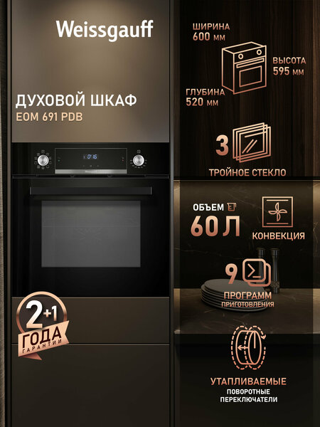 Новое поколение духовых шкафов от Weissgauff предлагает духовой шкаф, выполненный в великолепном дизайне MATT EDITION, имеющий дисплей с чувствительным сенсорным управлением. Тройное остекление дверцы отражает всю ту предусмотрительность, с которой мы подошли к её созданию. Утапливаемые рукоятки PIPO, дополняет богатый функционал, представленный сразу 9 режимами! Благодаря всему этому вы сможете полностью управлять процессом приготовления пищи, добиваясь идеального результата каждый раз! Удобный сенсорный дисплей с крупной индикацией - это настоящая гордость Weissgauff, ведь он не только является интуитивно понятным, но и великолепно реагирует на прикосновения с первого нажатия даже в том случае, если руки влажные или прохладные. 9 функций духового шкафа, предлагающих самые необходимые и наиболее востребованные режимы: верхний и нижний нагрев (традиционное приготовление), верхний и нижний нагрев с конвекцией, гриль, верхний нагрев с конвекцией, нижний нагрев, гриль с конвекцией, энергосберегающий режим приготовления на гриле , освещение духового шкафа и режим размораживания. Объем XL 60 литров дает вам полную уверенность в том, что приобретая этот духовой шкаф, вы сможете разместить в нем сразу весь необходимый объем пищи, и даже профессионально работать на нескольких уровнях одновременно, порадовав себя и своих близких настоящим пиром, приготовленным в духовом шкафу Weissgauff на действительно ресторанном уровне. Эмаль SMART CLEAN - это особое покрытие духового шкафа, призванное сделать процесс ухода за ним еще более простым и удобным. Благодаря эмали, изготовленной и нанесенной с применением сразу ряда инновационных технологий, ваш духовой шкаф будет оснащен самым настоящим высокоэффективным щитом, препятствующим накоплению жира, запаха и загрязнений, образующихся вследствие многократного приготовления еды. Гидролизная очистка - особая технология, благодаря который вы раз и навсегда забудете те дни, когда духовой шкаф необходимо было с большим трудом вычищать, вкладывая в это непозволительно много времени и сил. Weissgauff понимает, что в современном мире время является одной из наивысших ценностей - поэтому мы оснастили данную модель функцией гидролиза: всего лишь добавьте небольшое количество воды, и духовой шкаф сам отпарит все загрязнения, используя "эффект сауны", после чего вам останется лишь провести по стенкам мягкой губкой, собрав их и удалив одним движением. Тройное стекло дверцы, воплощающее в себе весь подход к безопасности и термозащите, который Weissgauff реализовали в данной модели. Теперь случайные прикосновения к дверце духового шкафа во время процесса приготовления еды больше будут не страшны, ведь мы позаботились о том, чтобы фронтальная сторона духового шкафа никогда не нагревалась до опасных температур. Утапливаемые рукоятки PIPO - это эффективная защита элементов управления от случайных переключений и жировых испарений в процессе приготовления еды, а также дополнительное удобство при работе с духовым шкафом, дополняющее его технологическое совершенство. Съемные стекла дверцы, делают процесс очистки духовки гораздо более удобным и простым: всего лишь разберите дверцу за считанные минуты, чтобы совершить чистку всех труднодоступных мест, вернув облику вашего духового шкафа первозданную чистоту. Панель управления, выпо
