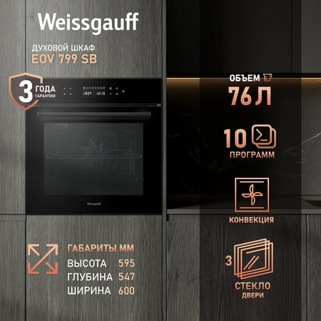 Новое поколение электрических духовых шкафов от Weissgauff предлагает модель, выполненную в черном закаленном стекле, имеющую полностью сенсорное управление, а также современный дисплей с белой подсветкой и расширенной индикацией. Тройное остекление дверцы отражает все то легендарное внимание к деталям, которым так славится продукция Weissgauff. Данный духовой шкаф станет не только отличным приобретением для вашей кухни, но и настоящим украшением интерьера, отражающим все совершенство вашего вкуса и стиля! Удобный сенсорный дисплей с крупной индикацией - это настоящая гордость Weissgauff, ведь он не только является интуитивно понятным, но и великолепно реагирует на прикосновения с первого нажатия даже в том случае, если руки влажные или прохладные. Объем XL 76 литров дает вам полную уверенность в том, что приобретая этот духовой шкаф, вы сможете разместить в нем сразу весь необходимый объем пищи, и даже профессионально работать на нескольких уровнях одновременно, порадовав себя и своих близких настоящим пиром, приготовленным в духовом шкафу Weissgauff на действительно ресторанном уровне. 10 функций духового шкафа, предлагающих самые необходимые и наиболее востребованные режимы: Верхний и нижний нагрев, Нижний нагрев, Гриль, Верний и нижний нагрев + вентилятор, Нижний нагрев + вентилятор, Гриль + вентилятор, Размораживание, Режим ферментации, "Аэрогриль" Режим интенсивного запекания, Режим освещения. Технология SMART MENU с визуальным отображением на дисплее выбранной программы приготовления и предустановленной температурой, которую духовой шкаф сам подберет вам оптимальным образом для каждого режима! При этом, вы можете менять уровень нагрева прямо в процессе работы устройства, управляя ходом приготовления блюда словно настоящий шеф-повар! Съемные стекла дверцы, делают процесс очистки духовки гораздо более удобным и простым: всего лишь разберите дверцу за считанные минуты, чтобы совершить чистку всех труднодоступных мест, вернув облику вашего духового шкафа первозданную чистоту. Эмаль SMART CLEAN - это особое покрытие духового шкафа, призванное сделать процесс ухода за ним еще более простым и удобным. Благодаря эмали, изготовленной и нанесенной с применением сразу ряда инновационных технологий, ваш духовой шкаф будет оснащен самым настоящим высокоэффективным щитом, препятствующим накоплению жира, запаха и загрязнений, образующихся вследствие многократного приготовления еды. Панель управления, выполненная из закаленного стекла - станет финальным штрихом в совершенстве великолепного дизайна этой модели. Каждый раз, взаимодействуя с духовым шкафом от Weissgauff, вы будете в полной мере ощущать, как он способен нагревать не только еду, но и согревать душу, став настоящим сердцем вашего уютного домашнего очага. Класс энергопотребления А позволит вам еще раз убедиться в том, что Weissgauff способны создавать по-настоящему эффективные устройства, не расходующие при этом больше электричества, чем необходимо. Наслаждайтесь настоящими кулинарными шедеврами, приготовленными в нашем духовом шкафе, и при этом не тратьте лишние деньги на счета за электроэнергию - вот воплощение истинного немецкого подхода к созданию эффективной бытовой техники! Аэрогриль - это режим интенсивного для запекания блюд и используется для запекания, тушения, томления, сушки ов