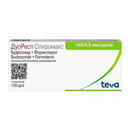 Для ингаляционного применения. 160/4,5 мкг/доза Бронхиальная астма Подбор дозы действующих веществ, входящих в состав препарата ДуоРесп Спиромакс, проводится индивидуально и в зависимости от степени тяжести заболевания. Это необходимо учитывать не только в начале лечения комбинированными препаратами, но и при изменении поддерживающей дозы препарата. Пациенты должны находиться под постоянным контролем врача для адекватного подбора дозы препарата ДуоРесп Спиромакс. ДуоРесп Спиромакс можно применять в соответствии с различными подходами к терапии: А. ДуоРесп Спиромакс для купирования приступов/симптомов с противовоспалительным действием (пациенты с бронхиальной астмой легкой степени тяжести). В. ДуоРесп Спиромакс в качестве поддерживающей терапии и для купирования приступов/симптомов с противовоспалительным действием. В качестве альтернативы, ДуоРесп Спиромакс можно применять в виде терапии в фиксированной дозе. С. ДуоРесп Спиромакс в качестве поддерживающей терапии (фиксированная доза). А. ДуоРесп Спиромакс для купирования приступов/симптомов противовоспалительным Действием (пациенты с бронхиальной астмой легкой степени тяжести) ДуоРесп Спиромакс принимается по требованию для облегчения симптомов бронхиальной астмы при их развитии и для профилактики бронхоконстрикции, вызванной аллергенами или физической нагрузкой (или для профилактики симптомов в ситуациях, по оценке пациеша способных спровоцировать приступ бронхиальной астмы). Формолерол, действующее вещество препарата ДуоРесп Спиромакс, обеспечивает быстрое начало действия (в течение 1-3 минут) с длительной бронходилатацией (как минимум 12 часов после приема однократной дозы) при обратимой обструкции дыхательных путей. Пациенту необходимо постоянно иметь при себе ДуоРесп Спиромакс для облегчения симптомов. Врачу следует обсудить экспозицию аллергена и объем физической нагрузки с пациентом и учитывать их при рекомендации частоты приема препарата. Взрослые и подростки (12 лет и старше): Пациенты должны принимать 1 ингаляцию по требованию при развитии симптомов и для профилактики бронхоконстрикции, вызванной аллергенами или физической нагрузкой, для контроля бронхиальной астмы. При дальнейшем нарастании симптомов в течение нескольких минут назначается еще 1 дополнительная ингаляция, но не более 6 ингаляций для купирования 1 приступа. Обычно не требуется более 8 ингаляций в сутки, однако можно увеличить число ингаляций до 12 в сутки на непродолжительное время. Пациентам, получающим более 8 ингаляций в сутки, рекомендовано обратиться за медицинской помощью для повторной оценки состояния и пересмотра терапии бронхиальной астмы. Требуется тщательный контроль за дозозависимыми побочными эффектами у пациентов, использующих большое количество ингаляций по требованию. Дети до 12 лет: эффективность и безопасность препарата ДуоРесп Спиромакс для купирования приступов/симптомов с противовоспалительным действием у детей в возрасте до 12 лет не изучены. В. ДуоРесп Спиромакс в качестве поддерживающей терапии и для купирования приступов/симптомов с противовоспалительным Действием При необходимости проведения поддерживающей терапии комбинацией ингаляционного глюкокортикостероида и агониста бета2-адренорецепторов длительного действия, пациент может пр