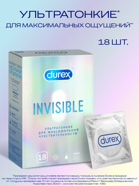 Durex Invisible (Дюрекс Инвизибл) — тонкие*, почти неощутимые презервативы для максимальных ощущений**. Ультратонкие* презервативы для максимальной чувствительности**, гладкие, с накопителем. Силиконовая смазка снижает трение и делает половой акт более естественным. Если любите надежность, вам стоит попробовать эти презервативы! Прекрасно подойдут для тех, кто хочет отбросить все детали и сосредоточиться только на партнере и сексе • Ультратонкие*; • Гладкие, с накопителем; • С силиконовой смазкой; • Бесцветные, из натурального латекса; • Толщина стенки презерватива: 0.043-0.052 мм; • Без неприятного запаха; • Длина – 180 мм, ширина – 52 мм. Дерматологически протестированы. 100% проверены электроникой. Ни один из методов контрацепции не может гарантировать 100% защиты от нежелательной беременности, ВИЧ или иных заболеваний, передающихся половым путем. *Презервативы категории Invisible являются самыми тонкими в линейке Durex® в продаже на территории РФ. **Опрос потребителей презервативов Durex® показал, что чувствительность зависит от толщины презерватива. Отчет по результатам исследования Рекитт Бенкизер (Соединенное Королевство), 2014 г, количество респондентов – 450.