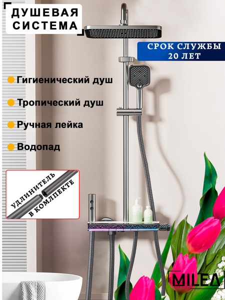 Душевая система с тропическим душем от бренда Milea потихорньку покоряет своими достижениями в категории сантехника. Наши многофункциональные душевые гарнитуры изготавливаются из премиальных материалов на самом технологичном заводе по итальянским технологиям. Смеситель для ванны включает в себя 4 разных лейки, имеет функции тропического душа, ручной лейки 3 в 1, гигиенического душа и режима крана. Каждый режим был продуман и протестирован более чем на 1000 людей. Душевая система идеально встроится в вашу ванну или душевую кабину. Благодаря дисплею, вы сможете наблюдать красивую анимацию при движении воды, и температуру жидкости, для этой функции не нужно использовать батарейки, вода сама вырабатывает электричество. Наш душевой комплект идеально встроится в любую ванную комнату, и будет однозначно приносить вам только радость.