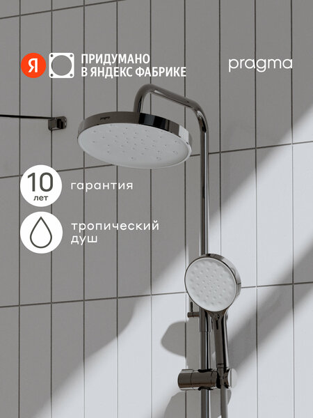 Pragma — это бренд эстетичных и функциональных решений для дома, придуманный в Яндекс Фабрике. Душевая система с тропическим душем и смесителем Olako — это чистые, правильные формы. Придаст интерьеру ванной комнаты современный стиль и сдержанность. Верхний душ с регулируемым наклоном, спа-эффект. Форсунки из мягкого силикона. Оснащена силиконовым душевым шлангом. Повышенная прочность и гибкость. Глубокий матовый хромированный цвет. Корпус смесителя выполнен из прочной латуни, устойчив к перепадам давления и температур. Стойкое хромированное покрытие против коррозии, его тяжело поцарапать. Хром останется ярким и блестящим надолго. Установлен мелкозернистый аэратор. Поток воды будет ровным и мягким, без брызг. А расход воды значительно снижается. Лёгкая очистка: достаточно провести пальцем. Используется усиленный керамический картридж и поворотный дивертор, надёжный при любой жёсткости воды. Обеспечивает точную регулировку температуры и напора воды и плавный ход ручки смесителя для умывальника. Эксцентрики, шланг, лейки и всё необходимое для комфортной установки уже в комплекте. Гарантия: 10 лет на корпус, 3 года на комплектующие и аксессуары.