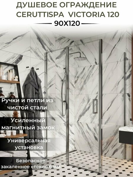 Ограждение VICTORIA120 душевое Ceruttispa без поддона (90x120x195) Размеры без поддона: 118х88х195 см Размер: 120x90x195 см* Прямоугольный уголок с распашной дверью – идеальный выбор для просторной ванной комнаты или сауны. Прозрачное стекло и алюминиевый хромированный профиль создают легкий ненавязчивый дизайн, который впишется в любое стилевое оформление помещения. Достоинства: • Ручки и петли Acciaio puro из чистой стали не подвержены коррозии. • За счет магнитного замка Soft close распашная дверь закрывается плотно и не дает воде просочиться наружу. • Быстрая сборка Quick staple: уголок можно собрать без использования силикона. • Право- и левосторонний монтаж. • Наличие пристенных профилей для удобства монтажа на неровные стены. Приобретается отдельно: поддон QR120/90 120х90х12, сифон * длина и ширина указаны с учетом поддона Внимание! Производитель оставляет за собой право вносить изменения в конструкцию и комплектацию моделей без предварительного уведомления!