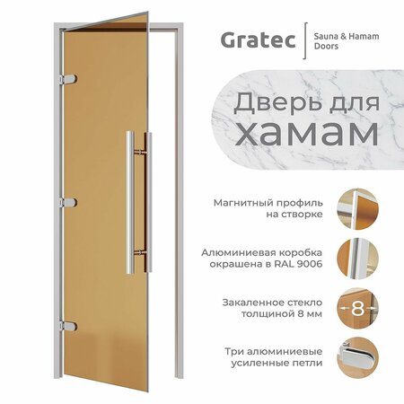 В этой модели нам удалась совместить лаконичный дизайн, технологичность, надёжность и доступную цену. Всё это мы реализовали в двери для хамам Gratec Gracia! Три усиленные петли обеспечат долгий срок эксплуатации 8 миллиметровой двери из закаленного стекла, окрашенного в массе цвета «бронза». Удобная и долговечная ручка из нержавеющей стали. Магнитный уплотнитель в алюминиевом коробе и нержавеющая кромка по периметру стеклянного полотна обеспечивают плотное закрывание двери. Используемые материалы и качество сборки увеличивают срок службы двери в первозданном виде на долгие годы. внимание! Новый размер. Установочный размер проёма: высота 1904 мм, ширина 716 мм Размеры дверной коробки: высота 1910 мм, ширина 729 мм, глубина 72 мм Размеры стеклянной створки: высота 1855 мм, ширина 659 мм, толщина стекла 8 мм