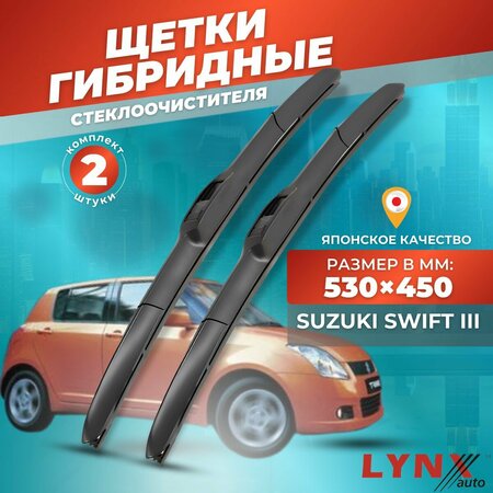 Комплект гибридных щеток для лобового стекла LYNXauto для Suzuki Swift III / Сузуки Свифт 3 2004 2005 2006 2007 2008 2009 2010 2011 (530-450 мм. Крючок) . Гибридные автощетки / дворники автомобильные LYNXauto - это всесезонные щетки, способные обеспечить плотное взаимодействие со стеклом любого профиля. Аэродинамическая форма и подвижный каркас обеспечивает идеальный прижим чистящей ленты к стеклу в любых режимах движения. Гибридная щётка стеклоочистителя для автомобиля LYNX производится по инновационным технологиям, объединяющий в себе преиумущества классических каркасных и современных бескаркасных щеток. Чистящая лента изготовлена из натурального каучука и дополнительно обработана графитом. Состав резиновой смеси и профиль чистящей ленты адаптированы для работы в широком диапазоне температур. Все это способствует качественной чистке стекла, срок службы щетки 1 500 000 циклов.