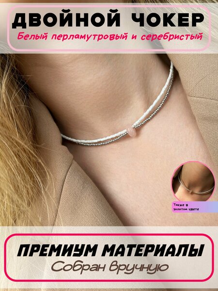 • Базовое двойное колье-чокер из белого перламутрового и серебристого чешского бисера.• Фурнитура - с родиевым покрытием - не потемнеют при носке. • Украшение на шею собрано на ювелирный тросик - не провисает. • Колье-обруч с подвеской из розового кварца - регулируется по длине и размеру за счет замка-цепочки. • Чокер подходит для повседневной носки, на праздник и под любой другой образ. • Собран вручную. • Чокер подойдет в подарок подруге/девушке/маме/коллеге на любой праздник : Новый год, день рождения, 8 марта, 14 февраля. Рекомендации по уходу: Не мочить - снимать при принятии душа, похода в сауну, бассейн. Снимать перед занятием спортом. Снимать перед сном. Надевать на сухую кожу - после полного высыхания кремов/духов/лосьонов. Хранить отдельно от других украшений.