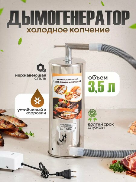 Дымогенератор для холодного копчения - это устройство, предназначенное для постоянной подачи дыма в емкость для копчения. Дымогенератор - неотъемлемый компонент холодного копчения - обработки продуктов дымом с температурой от 19 до 40 градусов Цельсия. Такой процесс может длиться много часов, до нескольких дней. Время копчения зависит от типа продукта и степени прокопченности, которую вы хотите получить в итоге. Дым подается в верхнюю часть коптильни холодного копчения, это обеспечивает качественную обработку по всему рабочему пространству коптильни. Копчение - это наиболее экологичный метод обработки продуктов. В процессе копчения натуральным густым дымом из мяса или рыбы выводятся все вредоносные микроорганизмы и бактерии. Срок хранения такой пищи увеличивается, а вкусовые качества усиливаются. Дымогенератор изготовлен из нержавеющей стали, стойкой к коррозии и окрашен снаружи молотковой эмалью. При использовании в домашних условиях выбирайте хорошо проветриваемое помещение. Технические характеристики Дымогенератора Дым Дымыч: напряжение - 220 V; номинальная потребляемая мощность - 2.9 Вт; производительность компрессора, л/мин - 2,5; давление - 0,012 МПа; материал - нержавеющая сталь, толщина стали - 0.8 мм; вместимость отсека для щепы 0,6 кг. Дымогенератор очень мобилен и легок в использовании, его можно взять с собой на дачу, в поход, в гости и в любое место, где вы хотите получить продукты с ароматом и вкусом копчения. Он станет отличным подарком туристам, охотникам, рыболовам и тем, кто любит почувствовать горячий запах копченной продукции собственного производства. Внимание! Емкость для копчения приобретается отдельно.