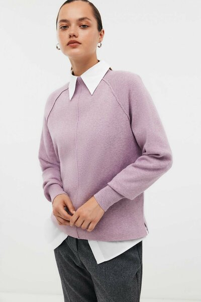 Уютные вязаные вещи - находка для холодов, ведь именно они позволят вам сохранить элегантность в любую погоду. Трикотажный джемпер с рельефными швами станет интересным элементом вашего повседневного образа. Эту модель нужно носить навыпуск: комбинируйте джемпер с брюками, юбками или низами из денима. Джемпер выполнен из смесового трикотажа, устойчивого к износу и растяжению. Вискоза в основе позволяет коже дышать, а также придаёт материалу плотность и шелковистость. Модель имеет прямой силуэт с рукавами-реглан, небольшой стойкой и разрезами по бокам. Манжеты и воротник изделия вывязаны эластичным рубчиком.