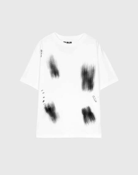 Уникальная обработка и винтажный дизайн объединились в этой футболке, отражающей современное мировоззрение! Эффектная модель прямого кроя добавляет чётких линий в силуэт. Она круто смотрится на парнях с любым телосложением. Футболка привлекает внимание за счёт принта в виде мазков краски и разрезов с булавками. Изделие из лёгкого джерси отлично впишется в любые стили: от повседневного до уличного. Его можно носить как унисекс. *Рекомендуем снимать с изделия металлические булавки перед стиркой. Детали: прямой расслабленный крой, круглый вырез горловины, короткие рукава, принт, разрезы с булавками. Гарантийный срок товара 30 дней.