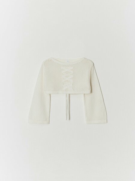 Укороченный джемпер для девочки бренда SELA с декоративной шнуровкой. Мягкий хлопковый трикотаж ажурной вязки. Круглый вырез горловины и расклешенный длинный рукав. Рельефная окантовка на горловине, манжетах и подоле.