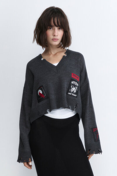 - Укороченный женский джемпер свободного кроя oversize из мягкой ткани толстой вязки - V-образный вырез горловины, манжеты и нижний край в рубчик и с трендовой рваниной. Длинные свободные рукава со спущенной линией плеча. Рваный пуловер с патчами и надписями в бунтарском стиле панк - Новая коллекция Befree стремится пробудить в тебе самые дерзкие идеи! Короткий пуловер с патчами в панк-стиле не оставит тебя без внимания. Носи его с рваными джинсами и колготками в сетку, дополняй образ ботинками на массивной подошве. Или сочетай дерзость с нежностью и надевай короткую юбку в стиле преппи, цветные колготки и аккуратные туфли без каблука. Проявляй все грани своего характера. Носи этот свитер на концерты, прогулки и встречи с друзьями или в кофейни (а еще мы не запрещаем тебе игнорировать правила и надевать его в школу или университет, дополняя оверсайз-пиджаком) - Размер на модели: S