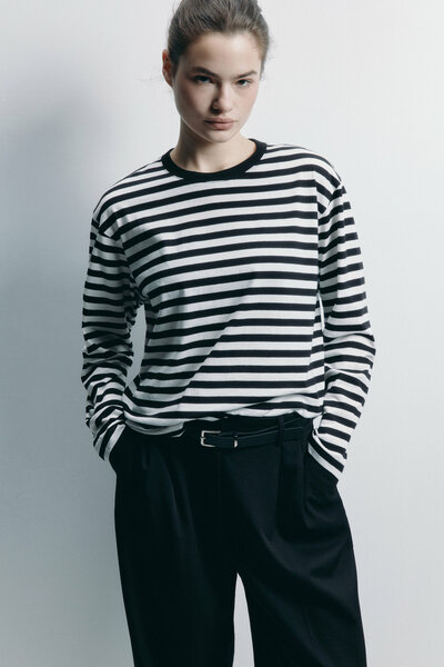 - Короткий трикотажный лонгслив свободного прямого кроя из мягкой, плотной и очень приятной к телу 100% хлопковой ткани с гладкой текстильной фактурой - Высокий круглый вырез горловины в рубчик, длинные свободные рукава с прямыми манжетами и спущенной линией плеча, прямой нижний край без разрезов и декоративных элементов - Базовая черно-белая тельняшка в полоску - стильная бессмертная основа твоего повседневного гардероба. Легкая хлопковая оверсайз-футболка с длинными рукавами идеально подойдет для суперудобных кэжуал-луков с твоими любимыми джинсами, брюками, юбками или шортами - Разбавь свои повседневные, школьные, спортивные или уличные аутфиты стильным лонгсливом из натуральной хлопковой ткани, который станет неотъемлемой частью твоего гардероба благодаря его универсальности. Свободный хлопковый оверсайз-джемпер в полоску из тонкой, дышащей и мягкой ткани для расслабленных повседневных луков, в которых тебе будет максимально комфортно - Размер на модели: S