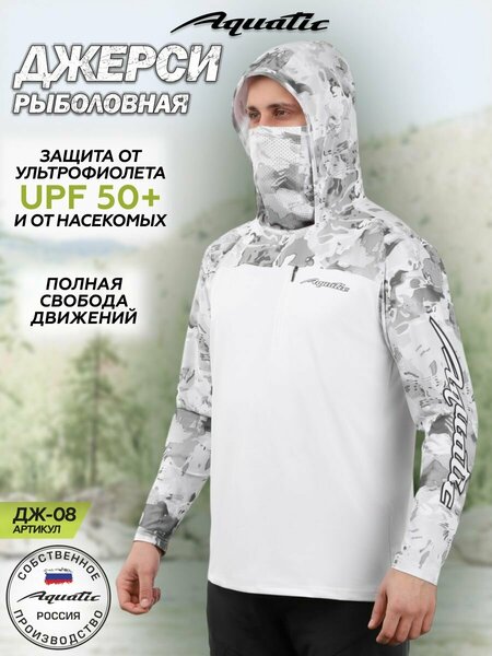 Джерси Aquatic с капюшоном и бафом Представляем вам инновационную модель рыболовной джерси Акватик, созданную для тех, кто ценит комфорт, функциональность и стиль. Джерси изготовлена из высокотехнологичной ткани Ultra Stretch — уникальной комбинации полиэстера и эластана. Материал обладает исключительной эластичностью, растягиваясь в четырех направлениях, что обеспечивает идеальную посадку, плотно облегая тело, но при этом не сковывая движений. Особенности модели: • Встроенный баф и капюшон: Новая модель джерси оснащена встроенным бафом с перфорированной тканью для легкого дыхания, а также удобным капюшоном. Это решение позволяет максимально защитить голову, лицо и шею от солнца, ветра и насекомых, делая ее незаменимой для активного отдыха на природе. • Комфортный крой: Продуманный дизайн сохраняет полную свободу движений даже во время самых интенсивных нагрузок. • Высокая степень защиты от ультрафиолета UPF 50+: Ткань блокирует 98% вредного ультрафиолетового излучения , защищая вашу кожу в течение всего дня. • Функциональные свойства ткани: Материал легко проветривается, обеспечивает быстрый отвод влаги, быстро сохнет и создает охлаждающий эффект в жаркую погоду. • Удобный нагрудный карман: Карман добавляет практичности модели, позволяя хранить мелкие предметы под рукой. Дизайн и долговечность: Рисунок нанесен с использованием современных красок, которые гарантируют яркость и стойкость принта даже после многочисленных стирок. Авторский дизайн джерси подчеркнет вашу индивидуальность и станет стильным акцентом вашего образа. Джерси Aquatic с капюшоном и бафом — это идеальное сочетание технологичности, комфорта и эстетики. Выбирайте качество, которое работает на вас!