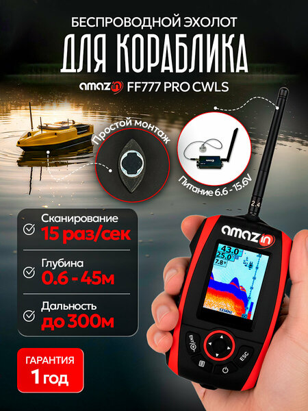 Новейший беспроводной эхолот Amazin FF777-PRO-CWLS, предназначенный для внутренней установки датчика в прикормочный кораблик, с дальностью сигнала до 300 метров, который станет достойной заменой эхолотов Lucky FF918-CWLS и Toslon TF520! Особенность нашей разработки! Есть возможность подключить к любому источнику питания 2s, 3s и 4s, в том числе от бортовой сети, так как в датчике установлен автоматический регулятор напряжения и фильтр помех, поэтому наводки сети не влияют на данные эхолота, в отличии от других эхолотов для прикормочных корабликов где обязательно нужно питать от отдельного источника питания. Встраиваемый в кораблик датчик CWLS предназначен для установки в прикормочный кораблик с внешней (выносной) кнопкой включения/выключения работы датчика. Питание передатчика осуществляется от Li-ion аккумулятора 2S-4S, входное напряжение 6.6V - 15.6V. Предусмотрено подключение напрямую к бортовому питанию прикормочного кораблика с защитой от помех. Потребление энергии передатчика составляет не более 300 mAh, при питание от 12 вольт (в сутки). Датчик CWLS работает на частоте 125 килогерц с углом охвата в 90°. Дает более подробное изображение поверхности и объектов в толще воды, позволяя искать рыбу на глубине от 60 см до 45 м! На экране основного блока отображается напряжение (заряд) передатчика. Что появилось в новой версии эхолота Amazin FF777-PRO-CWLS? 1) Увеличенная дальность сигнала до 300 метров, благодаря усиленной внешней антенне и беспроводному датчику CWLS, встраиваемого в прикормочный кораблик любого ценового сегмента . Это подарит Вам новые перспективы и поможет отыскать рыбу даже на значительном расстоянии. 2) Скорость сканирования водоема датчиком эхолота CWLS достигает 15 раз в секунду, с помощью луча, работающего на частоте 125 килогерц с широким углом охвата в 90°. Благодаря такой скорости, информация о отражённом сигнале передаётся на основной блок FF777-PRO в чистом виде, без искажений и без дописывания утерянных блоков (как к примеру это делается на эхолотах Lucky и др, где при потере данных дописываются вымышленные данные). 3) Для надёжной передачи данных и без потерь, более стабильным и быстрым является частота 2,4 ГГц, которая и используется на нашем эхолоте. Частота 433 недостаточна для передачи такого объёма данных. 4) Реализована возможность выбора каналов связи от 1 до 13. Возникают случаи, когда другие источники сигнала 2.4 ГГц, например прикормочные кораблики и другие эхолоты работающие на такой же частоте, мешают работе эхолота. Для предотвращения этого явления, в нашем эхолоте AMAZIN FF777-PRO-СWLS реализована возможность выбора каналов работы, что предотвращает интерференцию, а следовательно, возможное влияние на сигнал. 5) Упрощенный режим отображения при сканировании. 6) Возможность подключения беспроводного датчика-шар для рыбалки с берега (покупается отдельно). 7) Переносная фирменная сумка, включенная в комплект, позволит удобно хранить и переносить все принадлежности для эхолота, таким образом обеспечивая удобство и порядок во время рыбалки. Основной блок эхолота Amazin FF777-PRO: Обладает превосходной герметичностью и защитой от попадания воды по стандарту IP67. Яркий, цветной дисплей (512 цветов), диагональю 61,1 мм с разрешением V320 x H240 пикселей, позволяющий рыбачить даже в солнечную погоду благодаря антибликовому покрытию! Эхолот отобразит подробную информацию о рельефе дна, те
