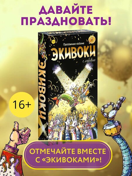 Юбилейная игра издательства «Экивоки» – настоящий подарок всем поклонникам издательства и любителям настольных игр для веселой компании. «Экивоки, с любовью» – захватывающая настольная игра для компании. Тема этой игры – праздник и атмосфера шумного семейного торжества. Как всегда, шедевральное игровое поле, полюбившиеся многим персонажи в новом исполнении, 150 карточек и более 800 заданий, которых хватит больше чем на 30 часов игры нон-стоп! А еще – красивая удобная коробка с отделением для компонентов игры, чтобы ничего не потерялось. Если вы уже играли в Экивоки, то знаете простые правила. Бросаете кубик, вытаскиваете карточку с заданием и объясняете слово необычными способами: данетки, рисунки, жесты, песни, пластилин и многое другое. Самое интересное – это задания. «Экивоки» – кладезь народного юмора: мемы, приколы, игра слов. «Экивоки, с любовью» зайдут всем, кому нравятся игры для вечеринок, такие как Alias, «Активити», крокодил, «Угадай кто», «Кто я», игра в мемы и смешные игры на ассоциации. Игра отлично подойдет на семейный праздник, вечеринку, для подруг и друзей или в подарок: на день рождения, 23 февраля, 8 марта или на Новый год. Красивую и оригинальную коробку приятно преподнести лучшей подруге, другу, сестре или брату в подарок. А если вам понравилась игра и вы хотите сыграть в нее с детьми помладше, то обратите внимание на игры издательства «Экивоки для все семьи» (12+) или «Экивоки для друзей» (7+).
