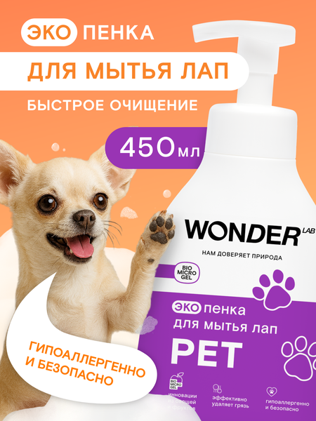 Эко пенка для мытья лап WONDER LAB: эффективное и безопасное средство Подходит для всех пород и размеров собак и кошек, а также для щенков и котят. Удобство использования: нанесите пенку на лапу собаки, протрите салфеткой и не смывайте водой. Безопасно при вылизывании и не сушит подушечки лап. Не вызывает аллергии. С дозатором: удобно использовать даже одной рукой. Большой объем упаковки и экономичный расход: 450 мл пенки хватит на долгое время. WONDER LAB - это российский бренд, который заботится об окружающей среде, здоровье людей и животных. Все средства бренда не содержат токсичных компонентов и опасных веществ. Высокая эффективность эко средств WONDER LAB основана на инновационной технологии BIOMICROGEL®, разработанной на основе растительных компонентов: крахмала, пектина и целлюлозы, которые получают из натуральных фруктов и овощей. BIOMICROGEL® разлагается в окружающей среде на 98 % за 24 часа, поэтому безопасен для всех членов семьи и природы. WONDER LAB предлагает широкий выбор товаров для стирки и уборки, ухода за телом и волосами, а также средств для мам и малышей. Вы можете ознакомиться с каталогом бытовой химии и товаров для дома Wonder lab - нажав на название бренда справа.