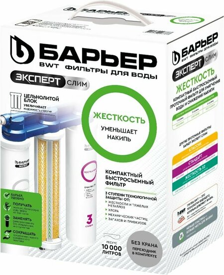 Компактный фильтр для специализированной очистки воды с повышенным содержанием солей жесткости без крана в комплекте. Оптимальное решение для тех, кто создает индивидуальный дизайн кухни и выбирает смеситель самостоятельно. Позволяет забыть о накипи и получить вкусную безопасную воду. Отличается от классической линейки эксперт статичным положением картриджей. Благодаря конструкторским решениям блок фильтра ("голова") отливается целиком, что позволило сделать вашу любимую модель фильтров еще надежнее и доступнее по цене. Удобная конструкция позволяет удобно разместить фильтр даже на небольшой кухне. Производительность - 2 л/мин. Ресурс 10 000 литров. Вода проходит три этапа очистки: 1."БАРЬЕР эксперт Механика" удаляет любые механические примеси до 5 мкм (песок, ржавчину и другие нерастворимые примеси) 2."БАРЬЕР эксперт Смягчение" предотвращает образование накипи. Эффективно снижает карбонатную жесткость, из-за которой образуется осадок в чайнике. Средний ресурс ступени при жесткости от 3 до 5 мг-экв/л составляет 500 литров. 3."БАРЬЕР эксперт ПостКарбон" - финишная очистка и кондиционирование, устранение неприятных привкусов и остаточного хлора. эксперт слим совместим со всеми картриджами линейки БАРЬЕР Эксперт и БАРЬЕР Актив. Один проточный фильтр БАРЬЕР за год помогает уберечь планету от полтонны пластика.