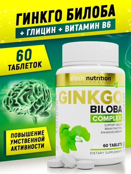 Экстракт Гинкго билоба +Глицин+витамин В6 aTech nutrition Комплекс для сосудов головного мозга 60 таблеток
