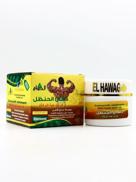 El Hawag - Мазь Колоквинта с маслом черного тмина от суставных и мышечных болей 50 мл Это о удивительное растение колоквинт растёт только в жарких пустынях . С древних времен арабы используют его для лечения. Его целительные свойства описаны Авиценной. С помощью этого растения лечится множество заболеваний. Показания к применению: для сокращения ревматических болей (в местах как плечи, колена, спина) для расслабления сокращающихся мышц и болей сопровождающих их. уменьшает чувство усталости после тренировок спортсменов в случаях артрита, острой подагры, воспаления поясно-крестцового радикулита при мышечных судорогах и при жестких хрящах Свойства: спелые плоды колоквинта в сочетании с экстрактом черного тмина уменьшают движение лимфоцитов также имеют прямое действие на сокращение болей в теле человека. помогает в случаях воспалительного артрита и острой подагры. укрепляет ткани и слабые клетки Применение: Втирать мазь массируя в течении 15 минут. Держать в тепле участок тела, на который была нанесена мазь. Состав: Плод колонквитаЭкстракт черного тминаМятаЭкстракт ментола натуральногоКамфора