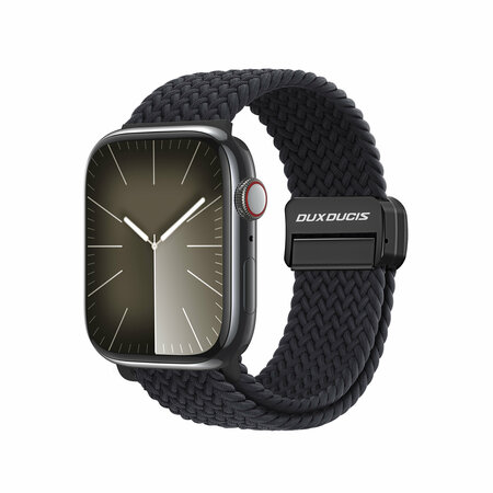 Ремешок для Apple Watch размером 42, 44, 45, 46 и 49MM серии Mixture Pro Series от Dux Ducis из высокоэластичного нейлонового плетения черного цвета (Midnight). Ремешок для часов изготовлен из высокоэластичного нейлонового плетеного материала, который не деформируется после растяжения и может быстро вернуться в свою первоначальную форму, поскольку ткань, сотканная с помощью нового метода плетения 4-мерного типа, отлично растягивается, устойчива к сминанию, мягкая, легкая и хорошо пропускает воздух, что лучше, чем у традиционных тканей. Он более приятен для кожи и удобен, его можно стирать, сушить и использовать повторно. Вогнутые и выпуклые пряжки оснащены сильными магнитами, поэтому ремешок не спадет с вашего запястья и его очень удобно снимать и надевать. Откройте пряжку, потяните ремешок, чтобы отрегулировать его в нужное положение, а затем затяните пряжку, чтобы завершить регулировку длины ремешка. Разъемы на обоих концах идеально подходят к пазам часов, что упрощает установку и снятие.
