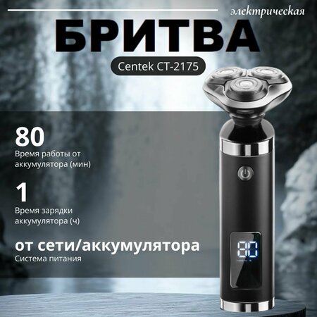 Электробритва Centek CT-2175 в стильном черно-серебристом корпусе имеет необычную форму и при этом удобно лежит в руке. Модель осуществляет сухой и влажное бритье за счет роторного мотора. Для особой гладкости кожи она имеет плавающую головку, оснащенную 3 секциями. Для удобства хранения она дополнена защитной крышечкой. Работать электробритва Centek CT-2175 может как от электросети, так и от собственного аккумулятора. Продолжительность функционирования от него составляет до 1 часа 20 мин. Дисплей с индикатором заряда «подскажет», когда устройство будет нужно подзарядить. Для удобства на время пополнения ресурса аккумулятора бритву можно разместить на специальной подставке. Очистить устройство после использования можно при помощи щеточки под струей воды.