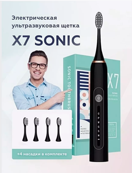 Электрическая ультразвуковая зубная щетка X7 SONIC Toothbrush - это современный и удобный способ ухода за гигиеной полости рта и десен. Головка щетки с щетиной средне-мягкой жесткости за счет высокой вибрации быстро и эффективно удаляет все остатки пищи и налет с зубов. 4 сменные насадки - щетина разной степени жесткости, небольшого размера, подходит для взрослых и детей. 6 режимов работы: - Clean - антибактериальная обработка; - Polish - режим полировки; - White - отбеливающая резонансная чистка пятен на эмали и зубного камня; - Gumcare - массаж десен; - Sensitive - людей с чувствительными деснами и зубами. - Massage - массаж для полости рта. Встроенный аккумулятор 800 mAh, до 50 дней автономной работы. Электрическая зубная щетка, ультразвуковая зубная щетка, электрическая зубная щетка детская, электрическая зубная щетка для взрослых, ультразвуковая зубная щетка детская, зубная щетка для чувствительных зубов, зубная щетка средней жесткости. Число оборотов/движений щетки в минуту 46000 раза.
