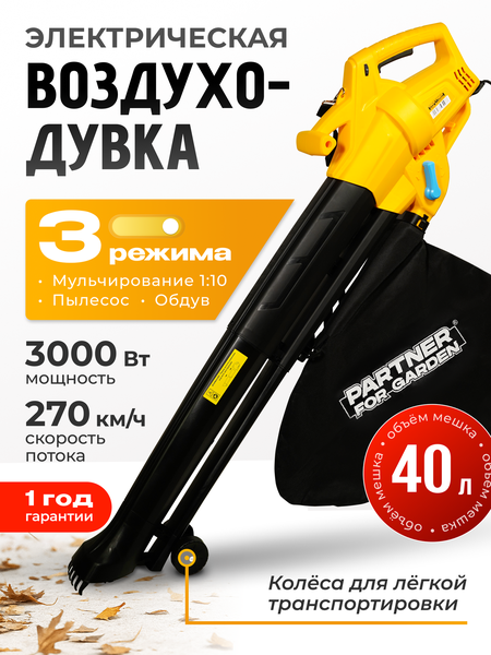 Электрический садовый пылесос Partner For Garden BE-3000: мощный и надежный помощник в саду Мощный и надежный электрический садовый пылесос Partner For Garden BE-3000 мощностью 3 кВт обеспечивает быстрый и эффективный сдув листьев и другого мусора с территории. Экологически безопасный и тихий в работе Низкий уровень вибрации и шума Простота управления и безопасность Регулировка скорости для комфортной работы Вместительный съемный травосборник на 40 л для удобства сбора мусора Регулируемый ремень для легкой переноски Съемные грабли для сбора листьев Колеса для удобства транспортировки Антивибрационная система для защиты пользователя Сдув, сбор, измельчение Электрический тип двигателя Максимальный объем воздушного потока 900 м³/час Максимальная скорость воздуха 66,6 м/с Мощность 3 кВт Количество сил в двигателе 4.08 Способ транспортировки на колесах Вес 2,7 кг Объем мусоросборника 40 л Дополнительная информация: воздуходувка пылесос электрическая, пылесос электрический садовый Особенности: мусоросборник, антивибрационная система Функции: всасывание, измельчение, обдув Выбирая электрический садовый пылесос Partner For Garden BE-3000, вы получаете мощный, надежный и удобный инструмент для уборки вашего сада.