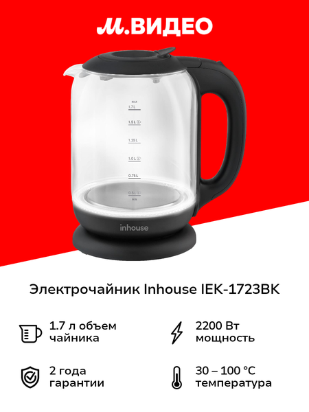 Электрочайник Inhouse IEK-1723BK мощностью 2200 Вт поможет быстро и безопасно вскипятить или подогреть воду. Максимальная вместительность колбы 1,7 л удобна для большой семьи и дружеской компании. • Стильная и прочная конструкция Корпус чайника выполнен из нержавеющей стали, пластика и термостойкого ударопрочного стекла – химически нейтрального материала, который не меняет вкус воды. Двусторонняя мерная шкала с шагом делений 0,25 л позволяет контролировать уровень жидкости. • LED-подсветка При работе прибора включается голубоватая подсветка, которая позволяет наблюдать за процессом закипания воды. • Простой уход и очистка Крышка прибора открывается одним нажатием до 70°, позволяя удобно заливать воду. Скрытый нагревательный элемент упрощает процесс очистки внутренних стенок. • Поворотная на 360° платформа Корпус прибора совмещается с базой, которая подключается к электросети и свободно вращается, что позволяет устанавливать чайник в любом положении. Прибор оснащен функцией автоотключения при закипании, перегреве, отсутствии воды в колбе. Предусмотрено компактное хранение сетевого шнура внутри подставки.