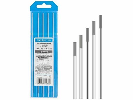 Электрод вольфрамовый для TIG сварки 2,4 мм SOLARIS WC-20 серый 5 штук (WM-4518) легированный до 2% оксидом церия. Это универсальный электрод, который может использоваться как для сварки на переменном токе, так и на постоянном прямой полярности. Легирование вольфрама оксидом церия обеспечивает простой, гарантированный поджиг дуги и увеличивает допустимый сварочный ток. По сравнению с чисто вольфрамовым электродом, цериевый электрод дает большую устойчивость дуги даже при малых значениях тока. Данный электрод может применятся для орбитальной сварки труб, сварки трубопроводов и тонколистовой стали.