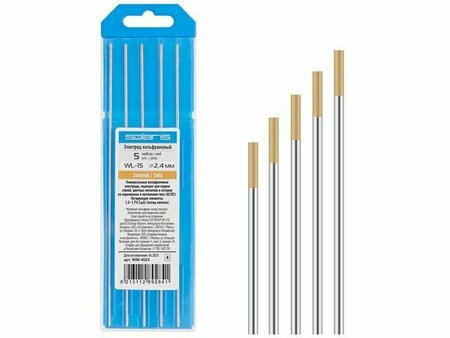 Электрод вольфрамовый для TIG сварки 2,4 мм SOLARIS WL-15 золотой 5 штук (WM-4524) с содержанием оксида лантана La2O3 (массовое содержание от 1,3 до 1,7 %). Универсальный электрод, который выдерживает высокие токовые нагрузки, улучшает стабильность горения дуги и легкость запуска при одновременном снижении выгорания. Характеризуется быстрым поджигом дуги, отсутствием прожогов. Годится для использования на высоких токах. Этот электрод меньше загрязняет вольфрамом шов, что особенно важно при финишных работах. А также длительное время сохраняет заточку рабочего конца. Применяется для сварки углеродистых и легированных сталей, алюминия, титана, никеля, меди и магниевых сплавов на постоянном и переменном токе (AC/DC).