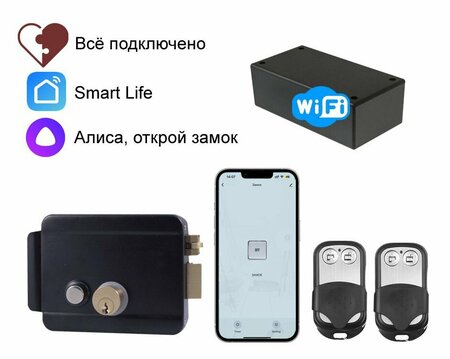 Для добавления замка в умный ДОМ алиса, нужно скачать приложение DIGMA SmartLife, добавить устройство, затем зайти в приложение умный ДОМ алиса и обновить список устройств. Электромеханический замок для калитки с управлением на радиопультах и с приложения на смартфоне. Управление электромеханическим замком со смартфона через wifi из любой точки мира и радио пультами на расстоянии. Для этого нужно скачать приложение Smart Life на смартфон. Комплект поставляется полностью в подключенном состоянии, для проверки работоспособности нужно включить блок питания в розетку. Радио брелки имеют на кнопках обозначение - закрыто / открыто. При нажатии на соответствующую кнопку замок выполняет это действие. Электромеханический замок с управлением с телефона позволяет удаленно открыть дверь с телефона при наличии сети интернет. Этот электрозамок также так же подключается к системе умный дом Алиса от Яндекс и при настройке можно открыть электромеханический замок на калитке с помощью голоса. Замок на калитку поставляется в подключенном состоянии, радио брелки прописаны в память контроллера, нужно самостоятельно подключить замок к Wi-Fi сети. В комплекте будет номер технической поддержки, обращайтесь за помощью в настройке системы. Комплект создан для тех, кто ценит комфорт и безопасностьСмартфон вместо радиопультаДля управления электромеханическим замком дистанционно с приложения на смартфоне нужно дотронуться на кнопку на экране. В приложении удобно раздавать доступ (временный или постоянный) к открытию замкаВременный доступ: по часам, по дням. А если был постоянный, то доступ отменяется за секунду путем исключения пользователя из приложения. Дистанционное управление замком радиопультомОткрытие электрозамка радиопультом на расстоянии до 200 мРадиопульт в этом комплекте служит больше для альтернативного открытия замка.