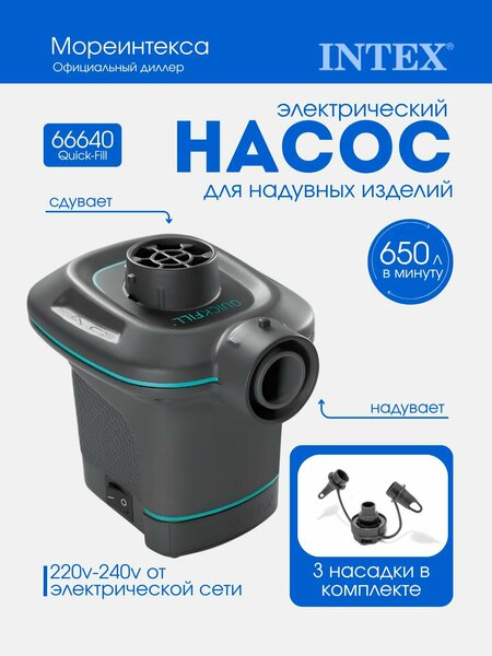 Электрический насос Intex 66640, работающий от сети 220V, рекомендуется для накачивания бассейнов, надувных кроватей и матрасов, батутов, игровых центров, лодок и других изделий. Интекс представляет новое поколение насосов - Intex Quick Fill с более эргономичным корпусом. Насос электрический будет просто незаменим дома и на даче. За небольшое время при помощи электрического насоса для ПВХ - изделий вы сможете накачать надувную кровать или детский батут и так же быстро их сдуть. Характеристики: Работает от сети 220V. Подходит для всех надувных изделий Intex. В комплекте 3 насадки - переходника. Позволяет не только надувать, но и сдувать изделие. Производительность: 650 л/мин. Обратите внимание - электрический насос Quick Fill предназначен для быстрого надувания вашего бассейна или матраса ориентировочно на 80% от максимального объема (во избежание перекачивания и порчи). При желании вы можете докачать изделие ручным или ножным насосом. Будьте осторожны! Избегайте перекачивания надувных товаров в жаркую погоду - при высокой температуре воздух внутри будет расширяться и изделие может лопнуть.
