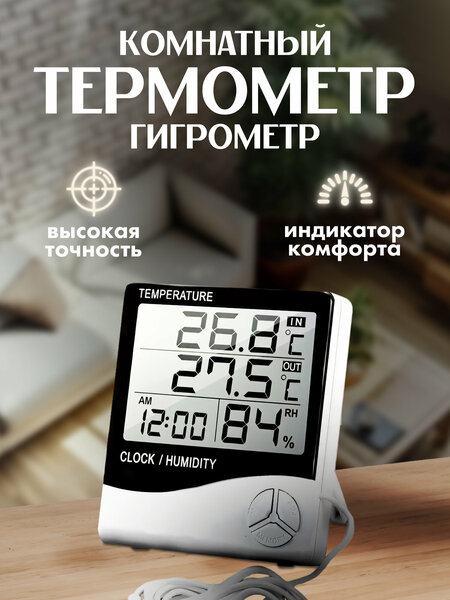 Домашняя метеостанция термометр HTC-2 с ЖК дисплеем и проводным уличным термодатчиком на 1 метровом проводе, который может находиться снаружи помещения, и выводится через окно, чтобы измерить и передать данные о температуре воздуха на улице. Электронный Термометр-гигрометр показывает точную температуру внутри помещения и снаружи, а также влажность воздуха в помещении, запоминает минимальное и максимальное значения температуры и влажности. В качестве дополнительной функции в устройстве имеются часы – будильник. Погодную станцию можно ставить на стол или вешать на стену, для этого на тыльной стороне его корпуса предусмотрена откидная подставка и специальное кольцо для подвешивания. Прибор идеально подходит для дома, детской и спальни, кухни или гостиной, офиса или бани, террариума и инкубатора. Настройка осуществляется с помощью трех кнопок управления, находящихся в нижней части лицевой стороны устройства. - Измерение уличной температуры: от -50°C до +70°C - Измерение комнатной температуры: от -10°C до +50°C - Измерение относительной влажности в помещении: до 99% - Часы / календарь - Будильник - Память минимальных и максимальных значений - Выносной датчик длина провода около 1 м - Настенное и настольное крепление - Питание (входит в комплект): батарейка типа ААА 1 шт - Выбор единиц измерения температуры: °C/°F - Точность измерения температуры: +/-0.1°C - Точность измерения влажности: +/-5% RH