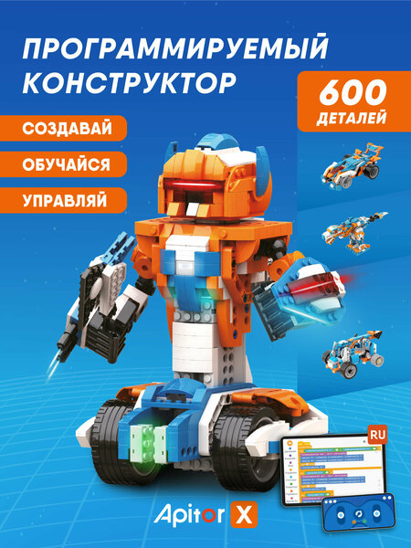 Apitor представляет обучающий развивающий набор Apitor Robot X 12 в 1 – программируемый детский конструктор, созданный по методологии обучения STEM. STEM – Science (Наука), Technology (Технология), Engineering (Инженерия), Mathematics (Математика). Добро пожаловать в мир будущего! Набор Robot X познакомит ребёнка 8, 9, 10 лет с основами программирования в Scratch 3.0 и робототехникой, поможет развить пространственное мышление и воображение, вдохновит на творчество. А ещё он станет прекрасным подарком на день рождения, Новый год, 23 февраля и другие значимые события, как для девочки, так и для мальчика. Освойте скретч программирование с конструктором Apitor. Интересно будет даже родителям! Создавайте модели и управляйте ими с помощью бесплатного приложения Apitor Kit в телефоне или планшете. – Программируемый Scratch конструктор – электронный. При сборке выбирайте из 12 готовых моделей, например, гоночную машину или динозавра, или создавайте собственные с нуля. – Напишите графический код самостоятельно или используйте заготовленный. Визуальный редактор кода позволяет без специальных навыков, буквально за считаные минуты, запрограммировать робота так, чтобы он мог двигаться. – Блоки Apitor Robot X совместимы с блоками других конструкторов популярных брендов. – Инструкции по сборке – в бесплатном приложении Apitor Kit! – Блоки рассортированы в лотки по размерам. Развивайте навыки организации и тратьте меньше времени на уборку! – Качественные и безопасные для детей материалы. – Конструктор работает от 3 батареек типа АА. Входят в комплект. Создаём, играем, исследуем. Вместе с Apitor и Robot X!